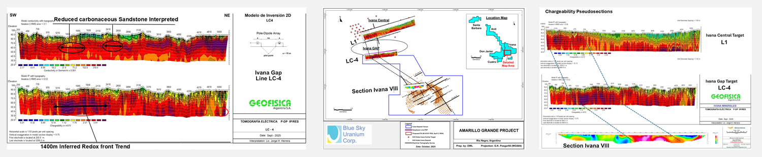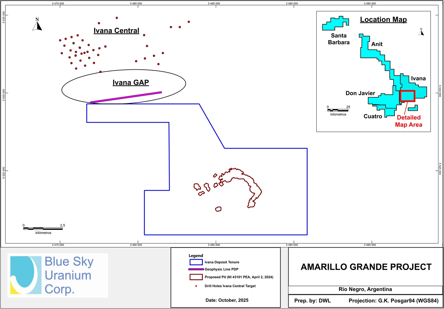 Vancouver, BC / CNW / October 16, 2025 / Blue Sky Uranium Corp. (TSX-V: BSK, FSE: MAL2; OTC: BKUCF), "Blue Sky" or the "Company") is pleased to announce that the Company has completed an induced polarization (pole-dipole electrical tomography (“ET”)) geophysical survey at the Ivana Gap target, located between the Company’s Ivana Deposit and Ivana Central target within the Amarillo Grande Uranium-Vanadium Project, Río Negro Province, Argentina (Figure 1). The properties hosting the Ivana Gap and Ivana Central targets are held by Blue Sky via its 100% owned subsidiary, Minera Cielo Azul S.A. (“MCA”).